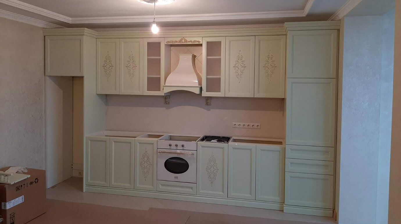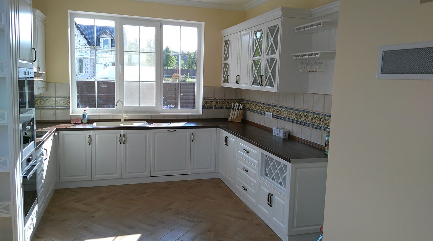 - Рамочная конструкция. Основой дверей в таких гарнитурах есть рамки. В центре же - филенка или стекло. Эта конструкция не ограничивает в использовании декоративных элементов. Итак, такая мебель гармонично украсит более насыщенные стили: от волшебного прованса и классики до величественного модерна.