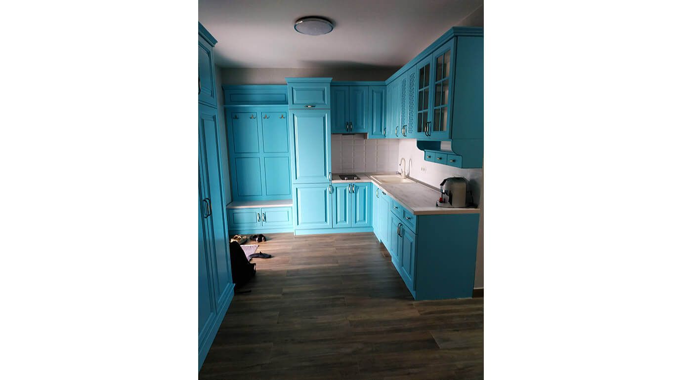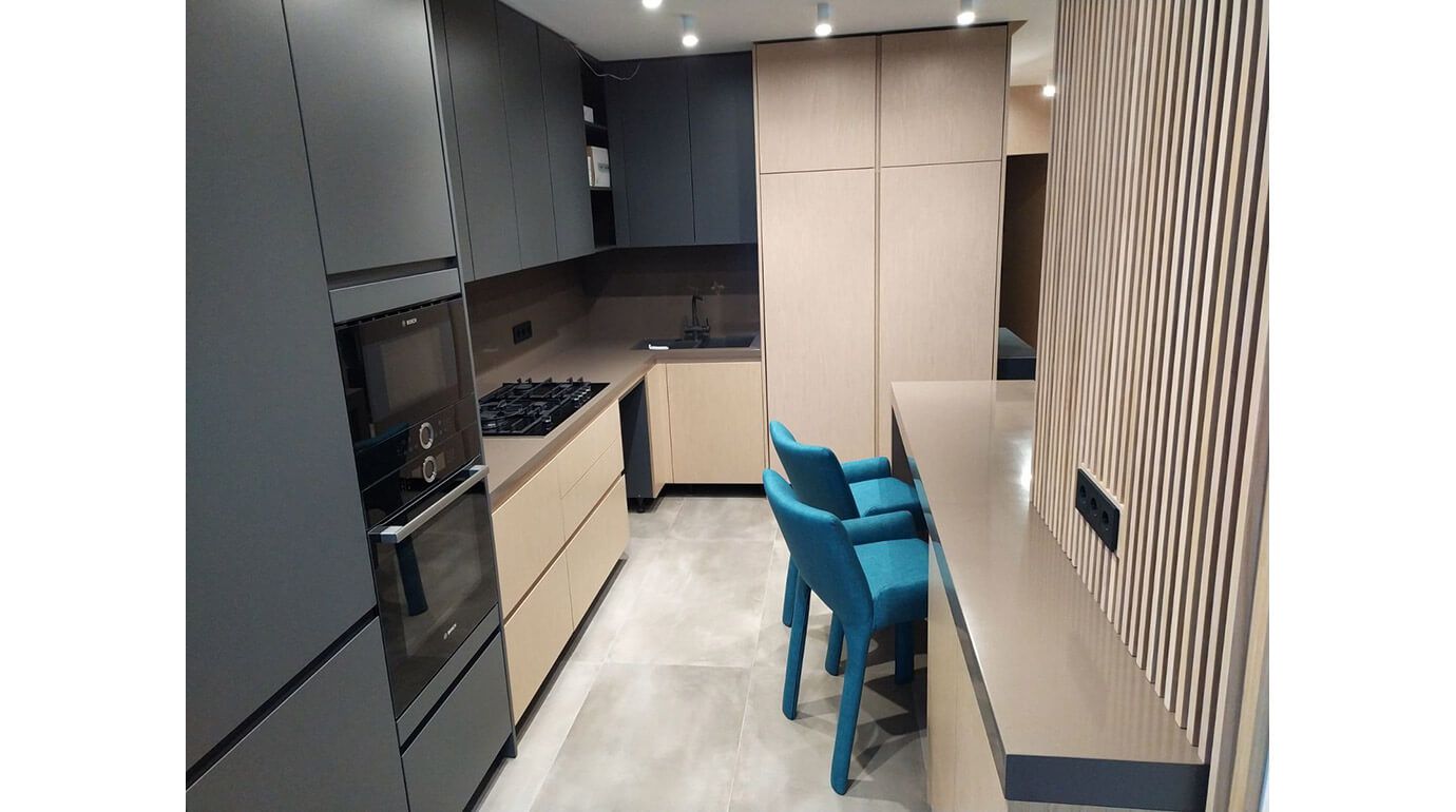 - Щитовая конструкция. Как несложно догадаться, дверцы таких гарнитуров мы изготавливаем из цельного щита. Кухни этого типа отличаются прочностью благодаря монолитности. В то же время их дизайн довольно лаконичный, а значит, идеально впишется в интерьер стиля лофт, сканди, минимализм или конструктивизм.