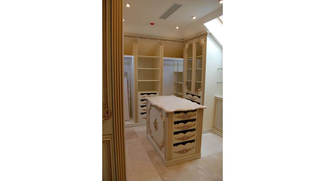 Залежно від доступної площі гардеробна може вміщувати лише функціональні шафи та стелажі або на додачу тумби, пуфи, стіл із дзеркалом для макіяжу й навіть невеликий диван.