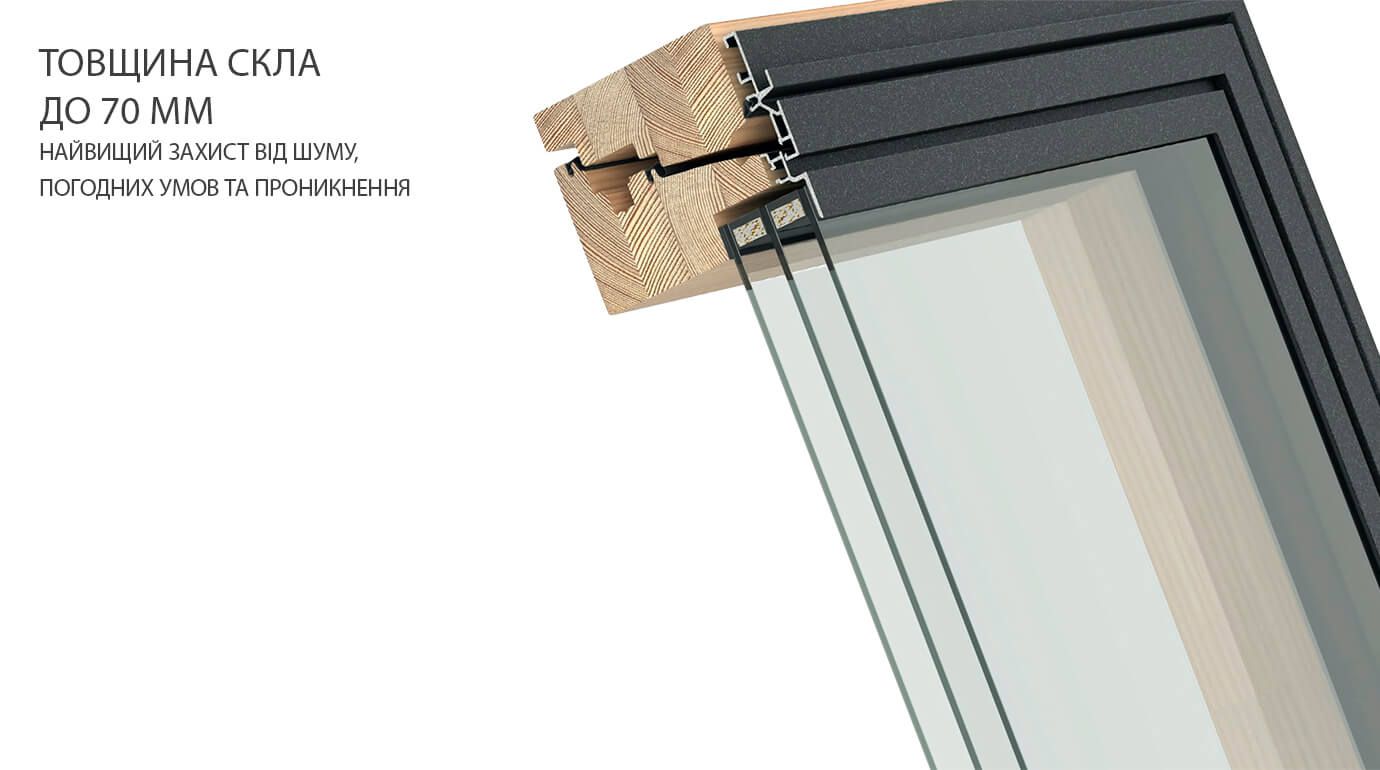 - Енергоефективність. Коефіцієнт теплопередачі 0,65 Вт/м²K. Максимальна товщина скла (до 70 мм) та рами (до 139 мм). Разом із тим ми досягли на 14 % вищої світлопропускної здатності.