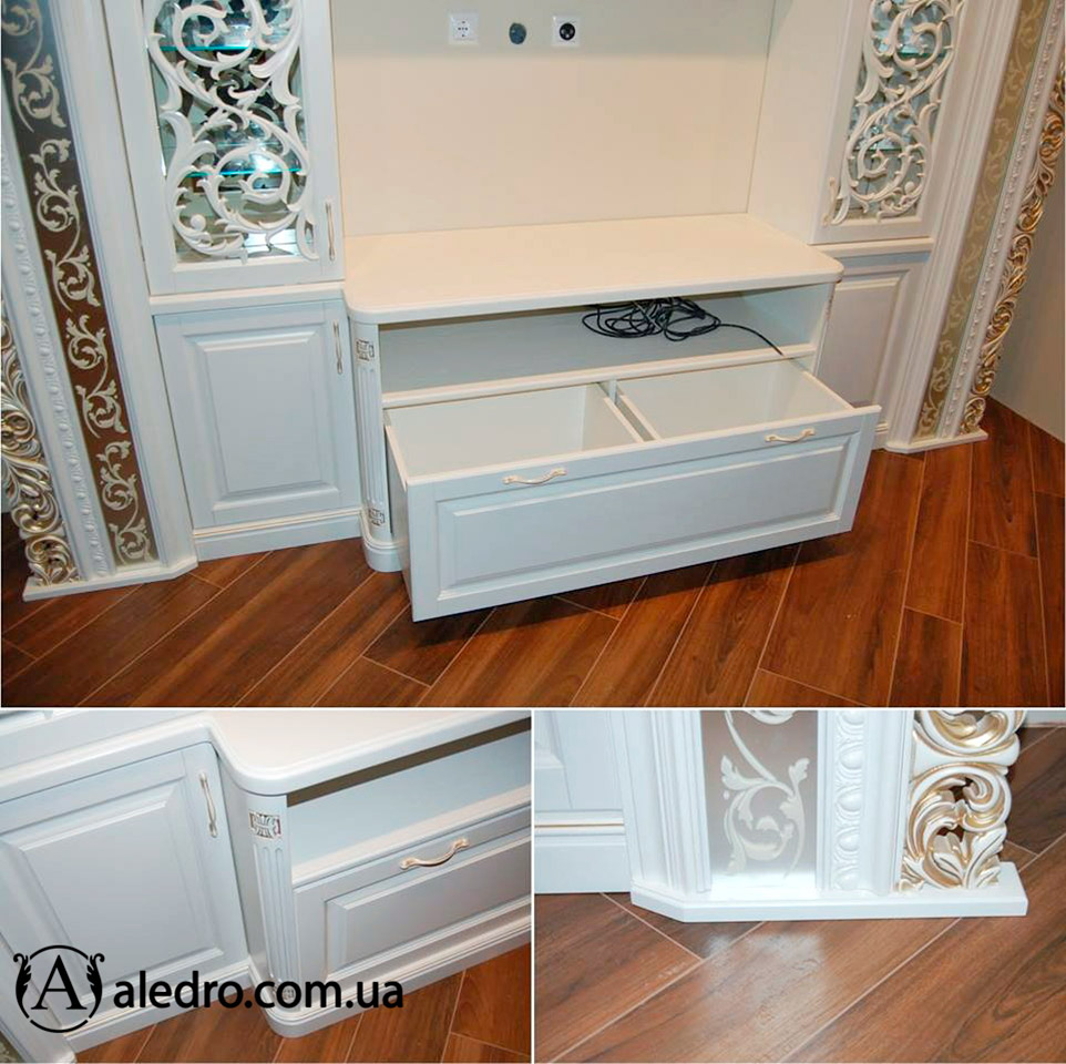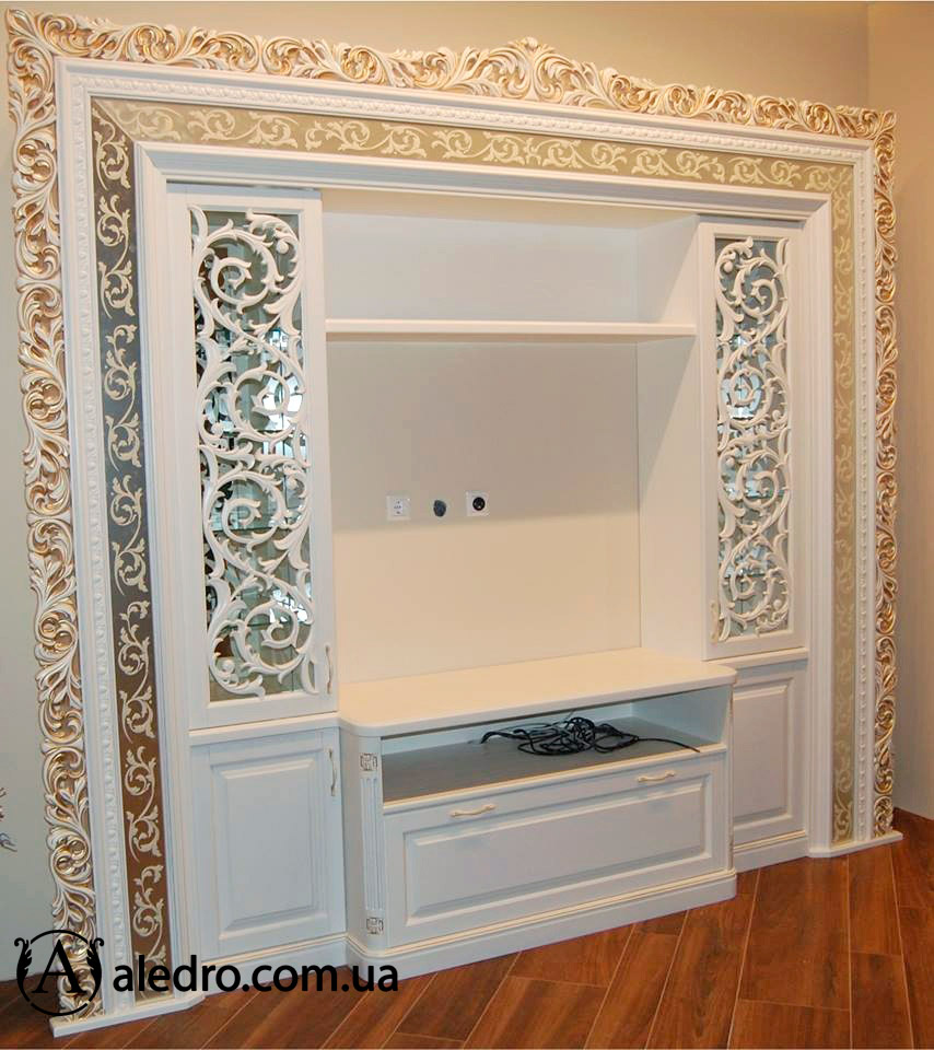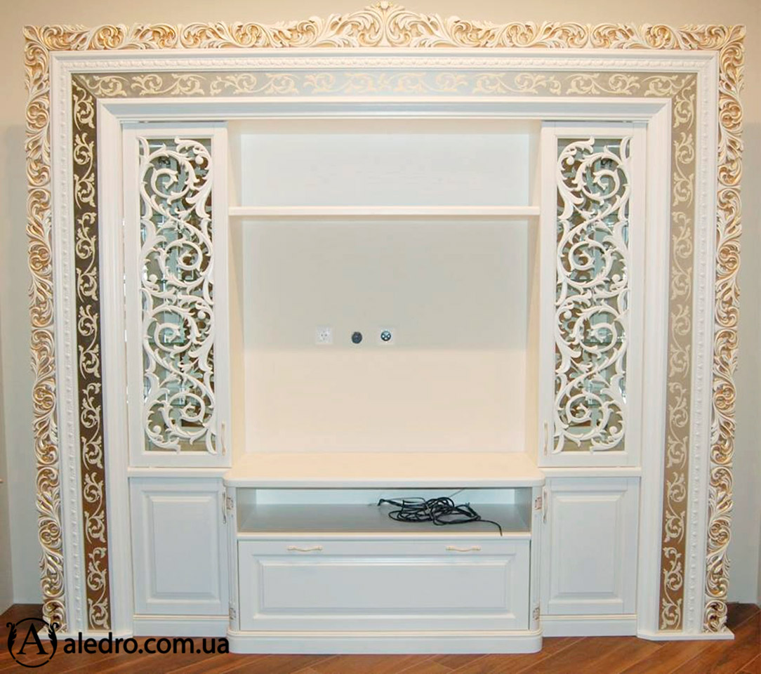 Вітрина з різьбленим декором в вітальню